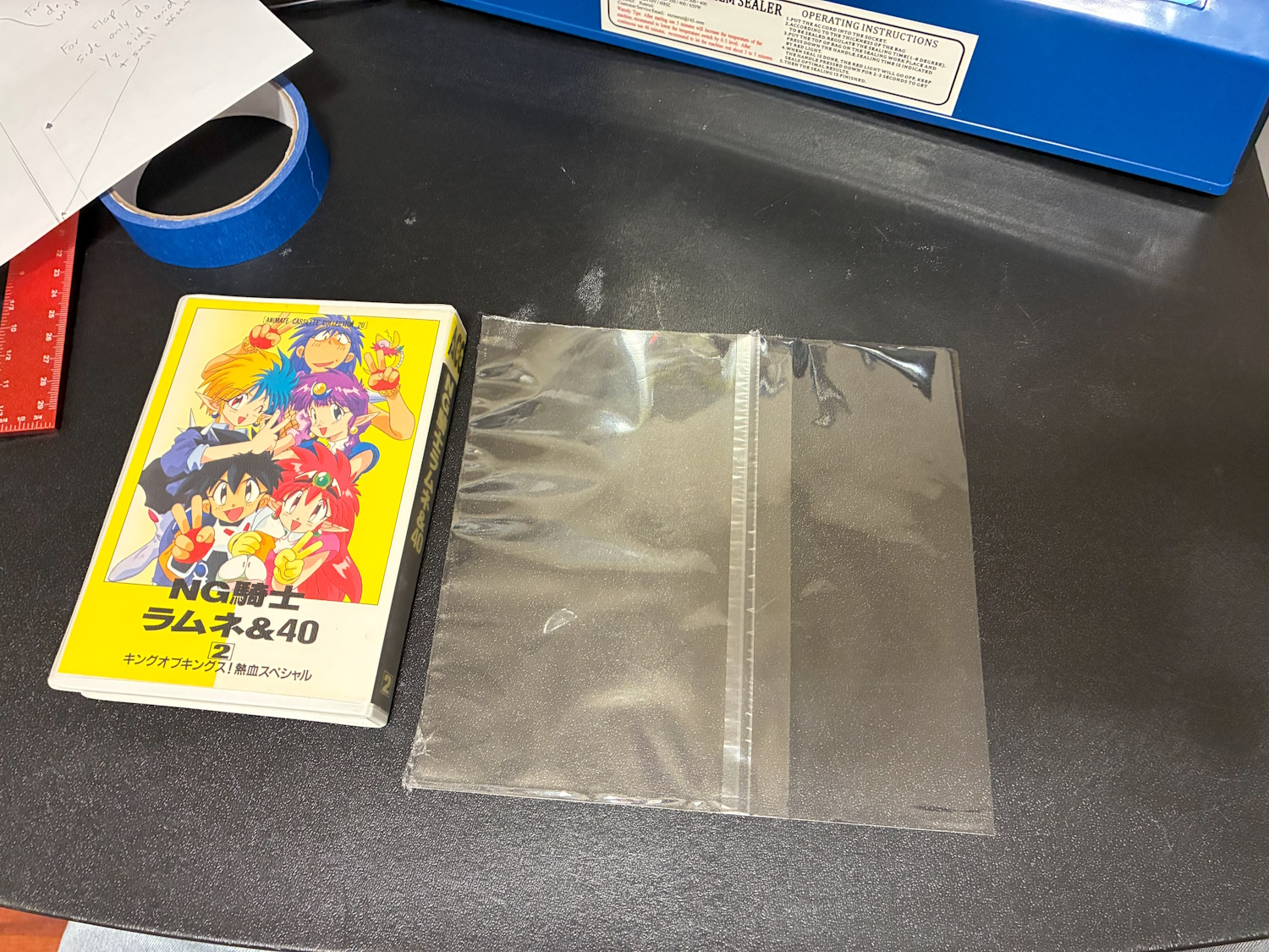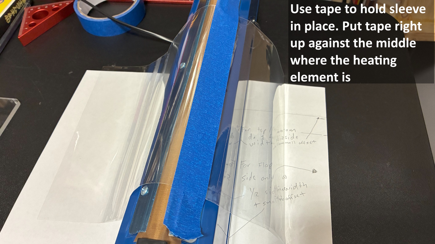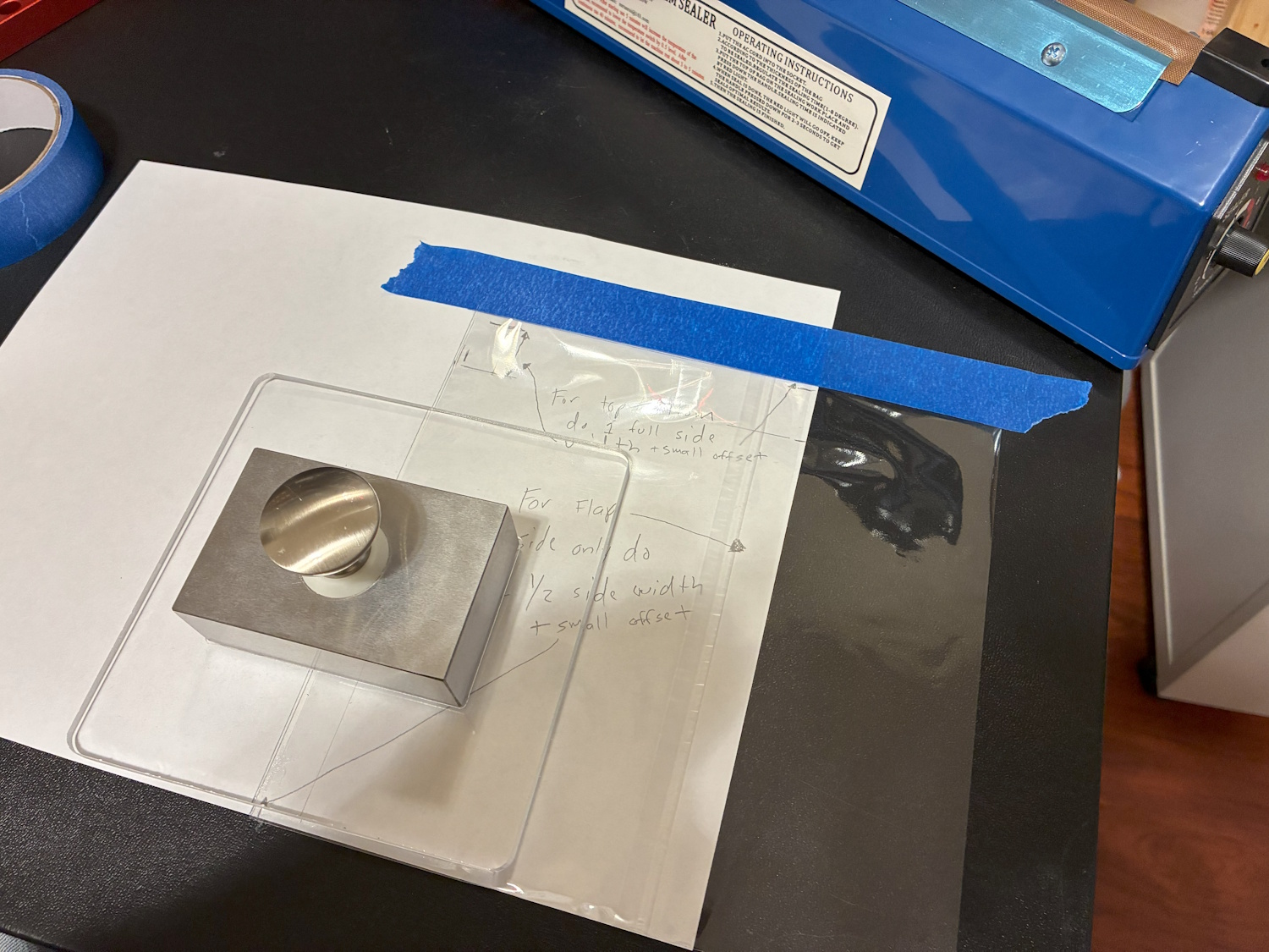 Use a piece of printer paper for making your template. Set the case on the corner of paper. Mark the boundaries Add the depth of the sides. 1/2 the depth for side opposite the flap. A full depth for other edge to the be cut. Put the sleeve over the paper. Use a weight to keep it from moving around. Use the tape to align the edge on the impulse bag sealer