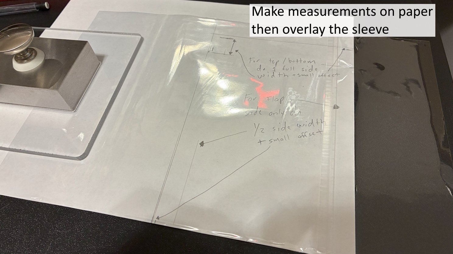 Use a piece of printer paper for making your template. Set the case on the corner of paper. Mark the boundaries Add the depth of the sides. 1/2 the depth for side opposite the flap. A full depth for other edge to the be cut. Put the sleeve over the paper. Use a weight to keep it from moving around. Use the tape to align the edge on the impulse bag sealer