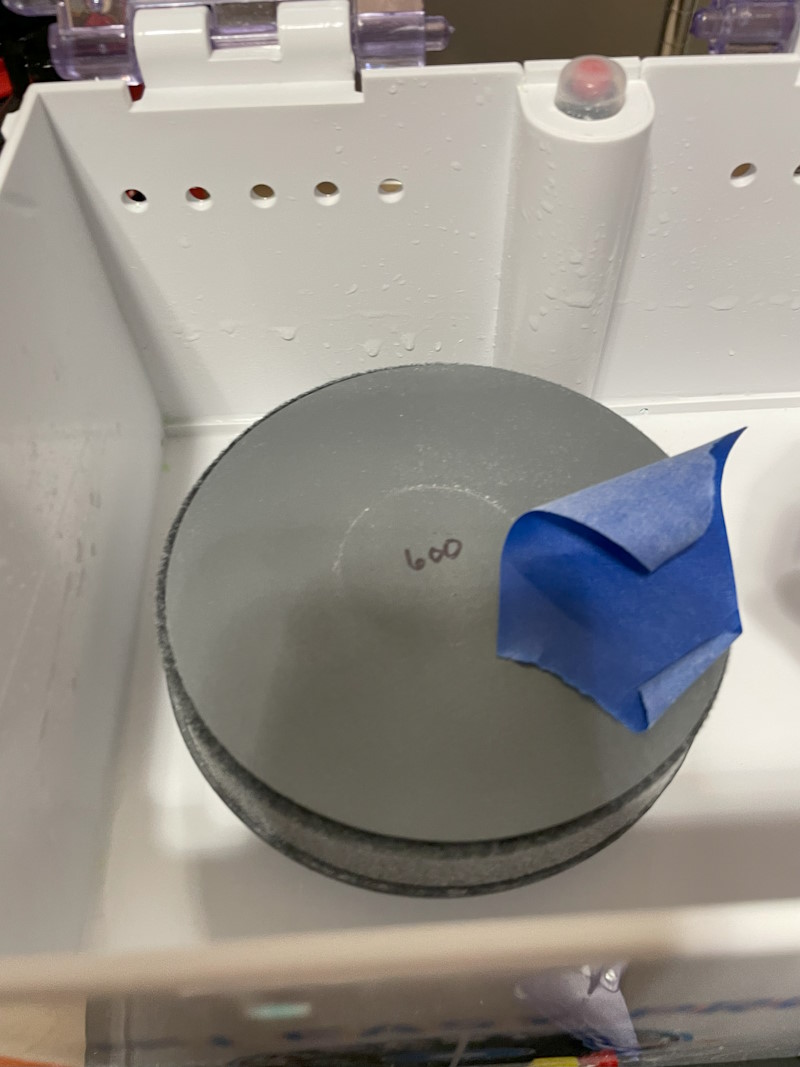 You don't want to do long bursts with the sandpaper because the disc and backplate will get hot and can cause damage to the plastic. Using water will help absorb the heat and also create a good sanding "slurry". I also used a spray bottle and small paint brush to spread water around on the sandpaper before each burst. Don't put too much water, because it will be slung off the moment you turn on the motor.