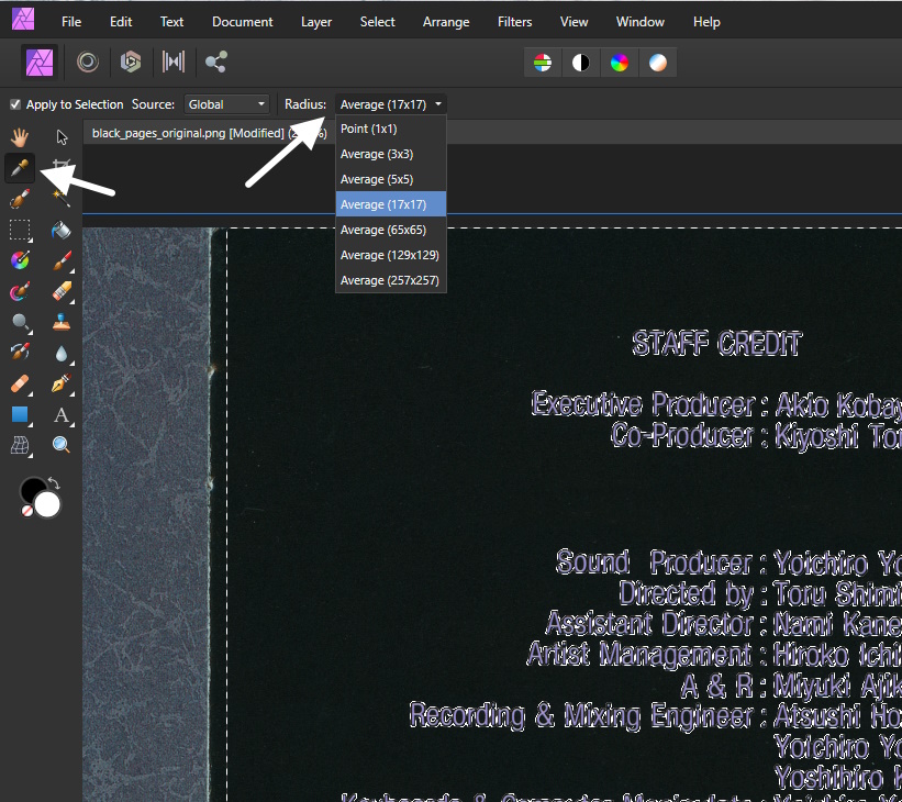 Next use the Color Picker (Eye dropper) and set the radius to a number that will get a good average of the color to be filled.