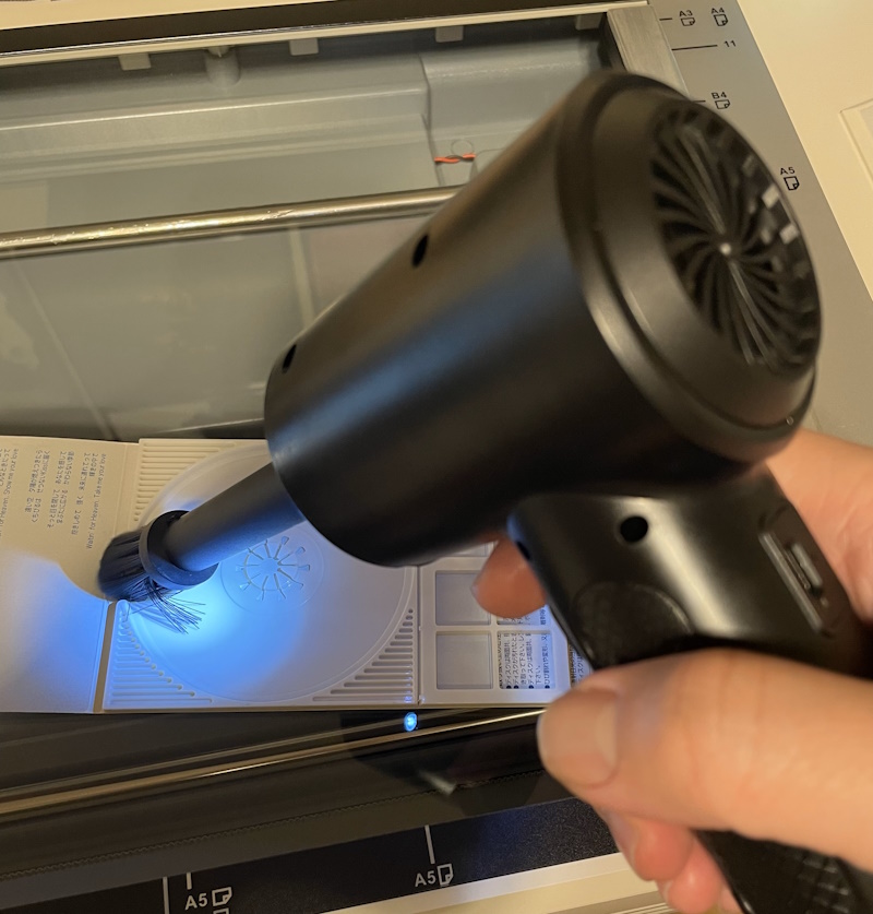 Compressed Air In A Can: Works very well for cleaning off dust. It uses a very small tube to cause very high pressure. The high air pressure can remove most dust. And the response is instant. It's also not very loud compared to other methods. But because of the chemical reaction it uses to create the air pressure, the can starts to get extremely cold after about 20-30 seconds. So the amount of continuous air blowing is limited. But they do work very well and can be purchased at brick & mortar stores like Best Buy, Walmart, Microcenter if you need them soon.