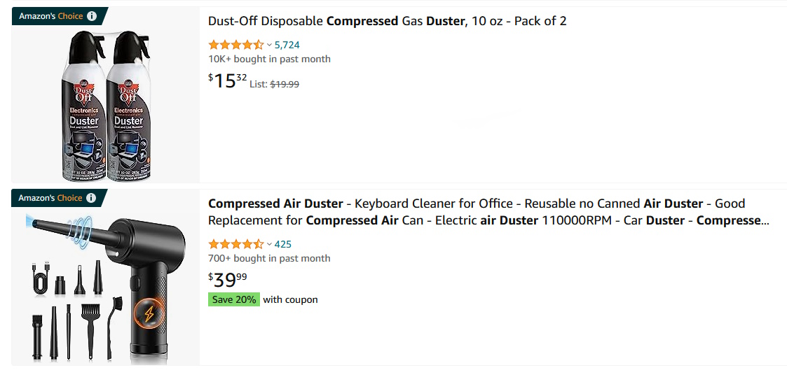 Compressed Air Dusters: Use a small motor to spin a compressor blade extremely fast to create high pressure. They are also battery powered so can be moved around easily. Because the motor spins at a high speed, they are very loud. As loud as a house vacuum. The spout that the air comes out of is also much larger than that of a can of compressed air, so the air pressure is not as high. But the difference is that the Air Duster has attachments. One of the attachments usually has brush bristles on the end. This combines the physical moving of dust with the high pressure air. This does a very good job of removing dust particles.