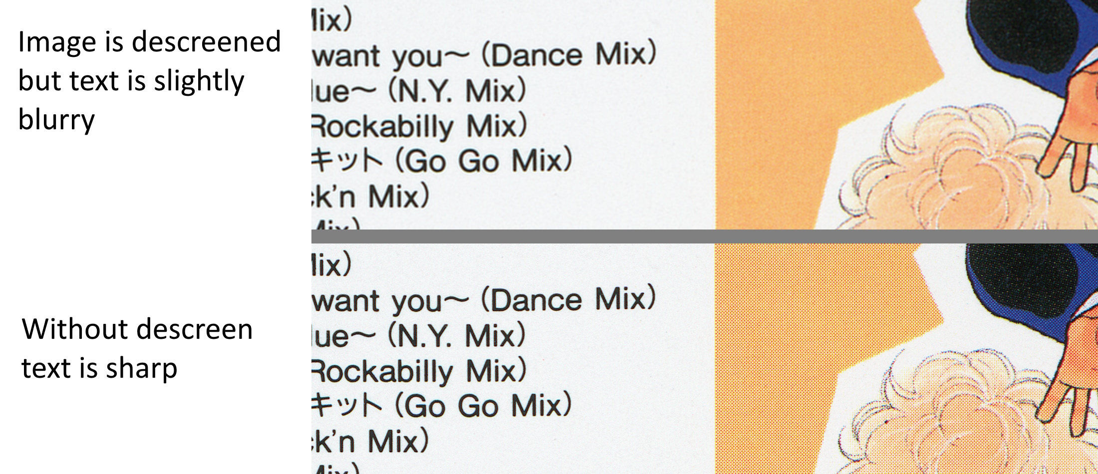 In this example there is text on the left that uses normal printing. And then an image on the right that uses half tones. If we descreen the entire image as a whole then the picture will look good, but the text will get some blurriness added as inherent by-product of the descreen process.