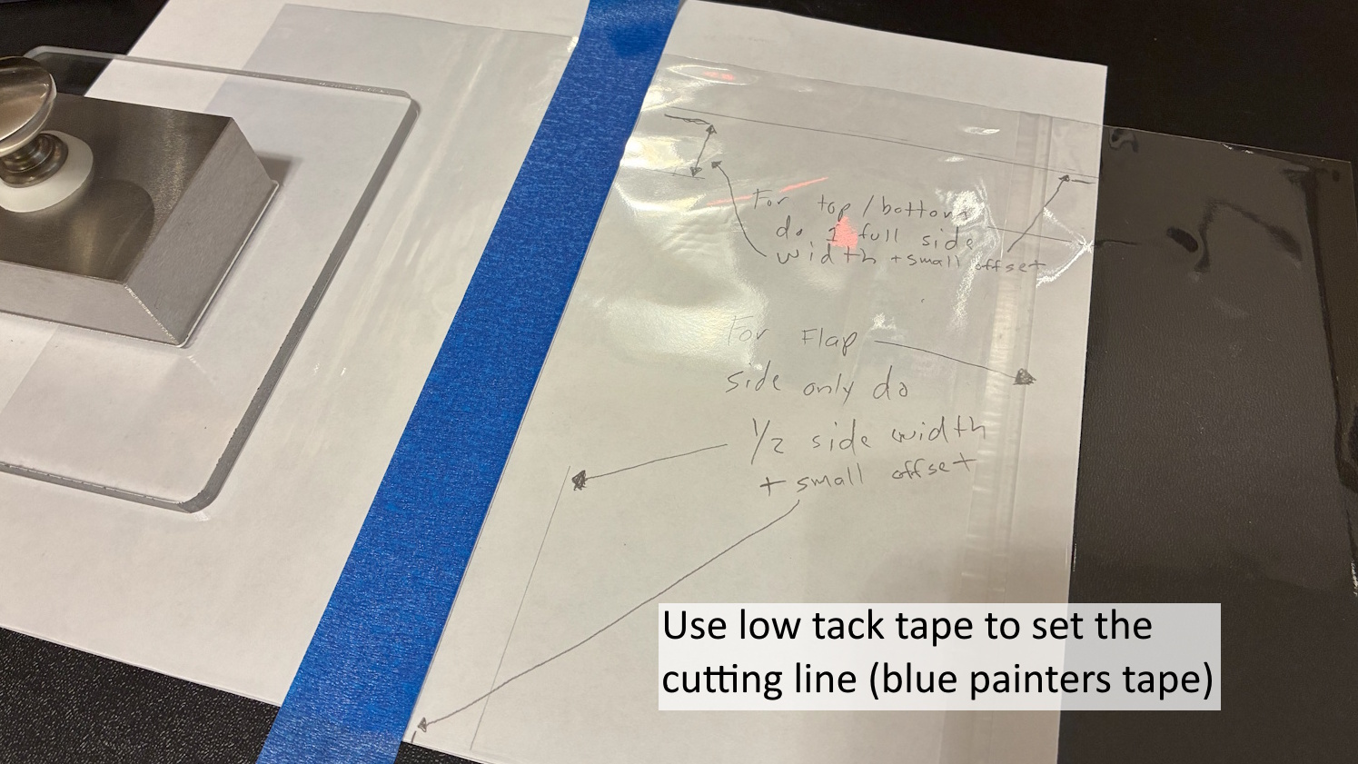 Use a piece of printer paper for making your template. Set the case on the corner of paper. Mark the boundaries Add the depth of the sides. 1/2 the depth for side opposite the flap. A full depth for other edge to the be cut. Put the sleeve over the paper. Use a weight to keep it from moving around. Use the tape to align the edge on the impulse bag sealer
